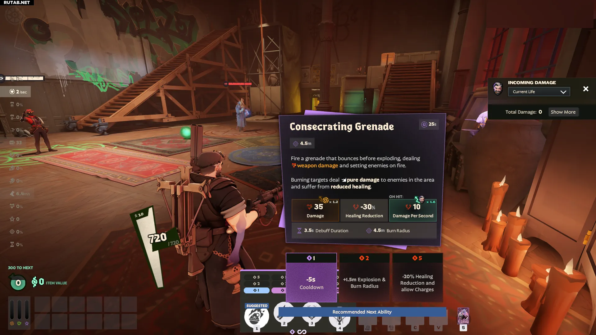 - «Освящающая граната» — наносит урон оружием, поджигает врагов, наносит «чистый» урон (игнорирующий сопротивления) и снижает лечение цели.