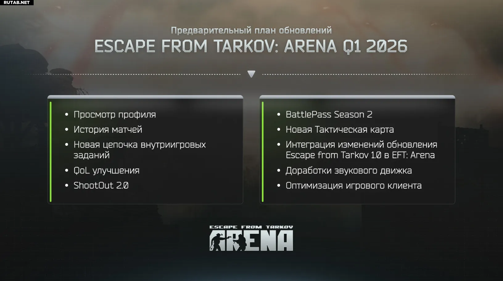 В планах студии — выпуск новой цепочки заданий, второго сезона боевого пропуска и добавление свежей тактической карты. Кроме того, в «Арену» будут интегрированы изменения, внедрённые в релизную версию основной игры Escape From Tarkov, которая вышла в ноябре 2025 года.