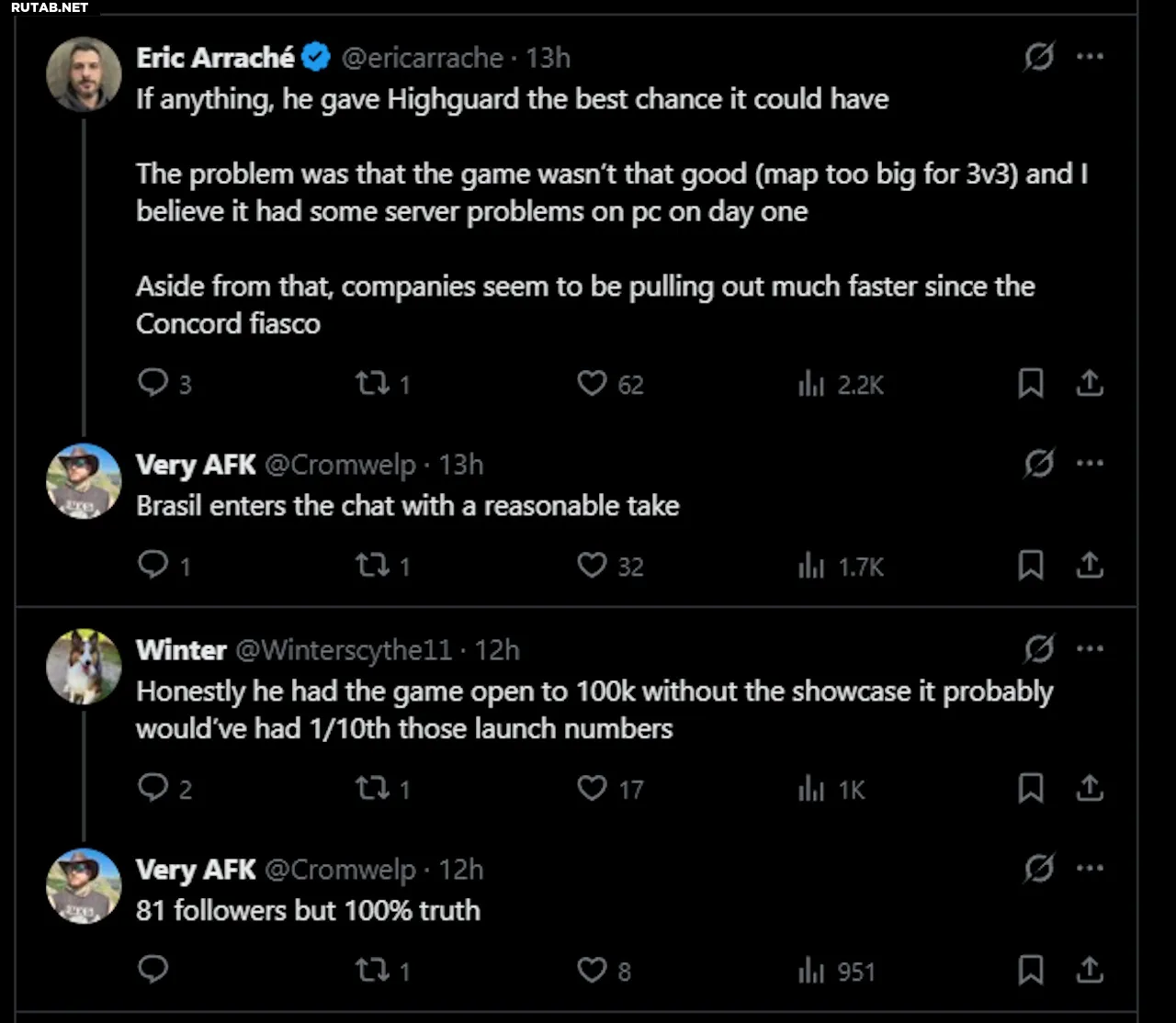 Он подчеркнул, что шоу Кили дало игре огромную аудиторию, которой у неё не было бы в случае внезапного релиза. По мнению Дауза, игроки в итоге не полюбили Highguard из-за того, какой игра получилась, а не из-за анонса.