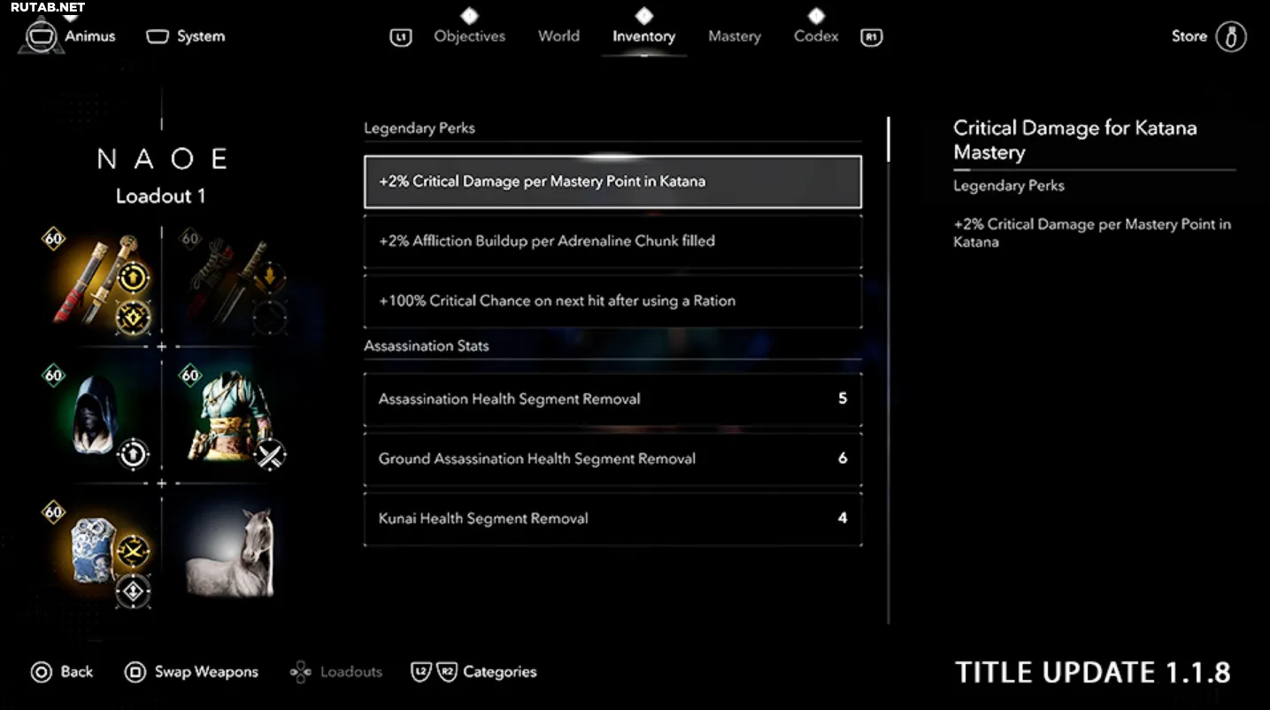 Помимо этого, разработчики из Ubisoft существенно доработали интерфейс инвентаря. Теперь в нём можно открывать детальную статистику по всему снаряжению и активным перкам, что упростит создание и тонкую настройку уникальных сборок персонажа. Также в игре появилась новая точка входа в «Анимус» рядом с убежищем, а полоска здоровья врагов стала более информативной при нанесении критических ударов.