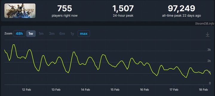 Недавно студия Wildlight уволила большую часть команды, насчитывавшей около 100 человек. Это неудивительно, учитывая крайне низкий интерес к проекту. На момент написания новости в Highguard играет всего 755 человек, а пиковое количество игроков за последние 24 часа составило 1507. Таким образом, проект потерял почти всех игроков (на пике их было около 100 тысяч).