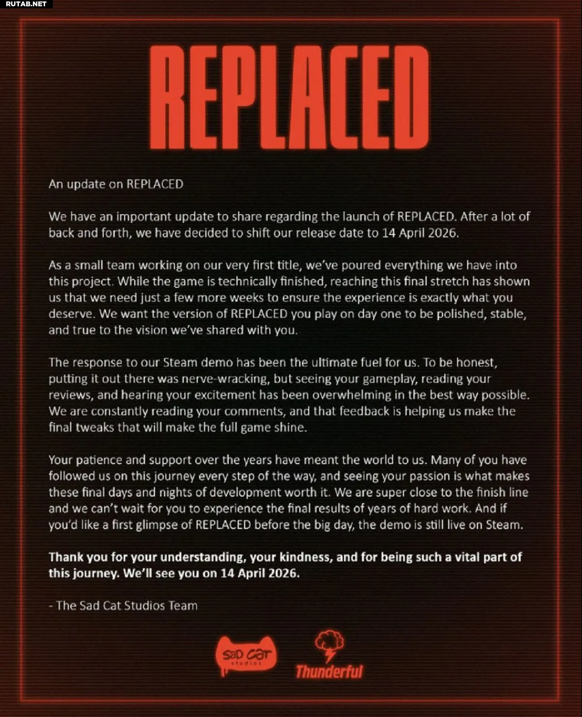 Команда также отметила, что на их решение повлияла позитивная реакция игроков на демоверсию Replaced, доступную в Steam. Видео с геймплеем и отзывы вдохновили разработчиков на внесение «окончательных изменений».