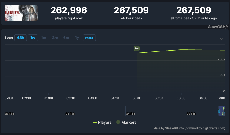 В данный момент Resident Evil Requiem одновременно запущена более чем 267 тысячами игроков только в Steam, что ясно демонстрирует масштаб интереса к релизу. Это отличный результат для новой части серии и очередное доказательство того, что бренд Resident Evil обладает гигантской притягательной силой на PC.