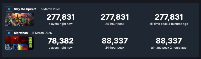 Речь идёт о Slay the Spire 2, которая вышла в ранний доступ и моментально взлетела в Steam. Согласно данным сервиса, Marathon на старте собрал 88 тысяч одновременных игроков, в то время как Slay the Spire 2 преодолела отметку в 277 тысяч заинтересованных. Стоит, однако, честно отметить, что новая игра от Mega Crit в настоящее время доступна только на PC, а Marathon стартовал одновременно ещё и на PlayStation 5 и Xbox Series X|S, поэтому полная картина запуска Bungie гораздо шире, чем одни лишь статистические данные Steam.