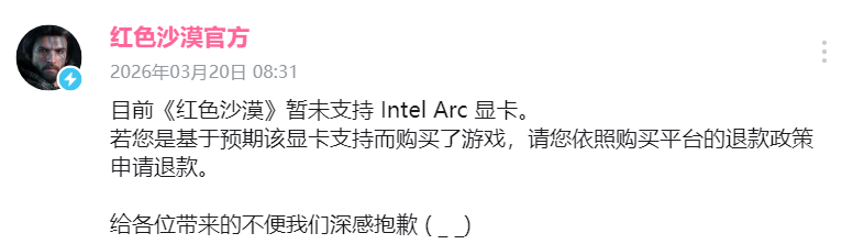 В ответ на жалобы официальный аккаунт игры опубликовал заявление, в котором говорится: «В настоящее время «Red Desert» не поддерживает видеокарты Intel Arc».