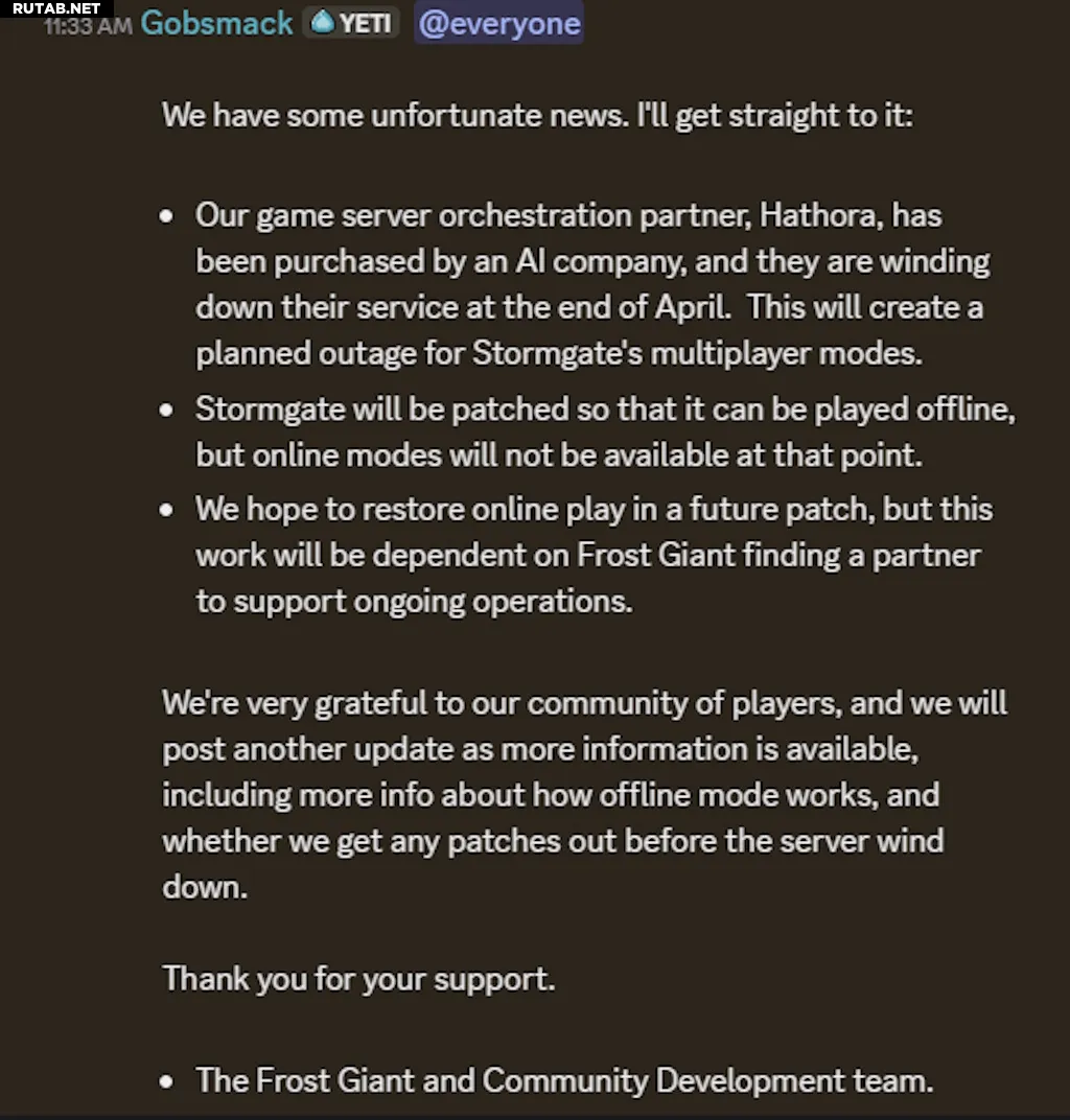 Разработчики стратегии в реальном времени Stormgate, вдохновлённой StarCraft, объявили о прекращении поддержки онлайн-мультиплеера. Причина — компания Hathora, предоставлявшая серверные решения для игры, была приобретена AI-компанией Fireworks AI и прекращает поддержку игровых проектов 5 мая.