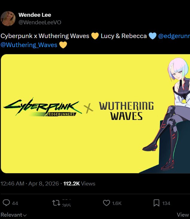 Актриса, озвучивающая одного из персонажей аниме «Cyberpunk: Edgerunners», рассказала, какие именно герои вселенной Cyberpunk появятся в Wuthering Waves — игре, получившей престижную награду по выбору игроков на The Game Awards 2025. Венди Ли сообщила, что в Wuthering Waves появятся Люси и Ребекка из аниме Edgerunners. Преждевременно опубликованный пост в X был быстро удалён, но игроки успели сделать скриншоты.
