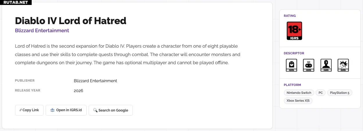 Однако, похоже, это может быть только началом. В сети появилась интересная информация — система рейтингов игр Индонезии (IGRS) оценила Diablo 4: Lord of Hatred, и среди целевых платформ неожиданно оказался Nintendo Switch.