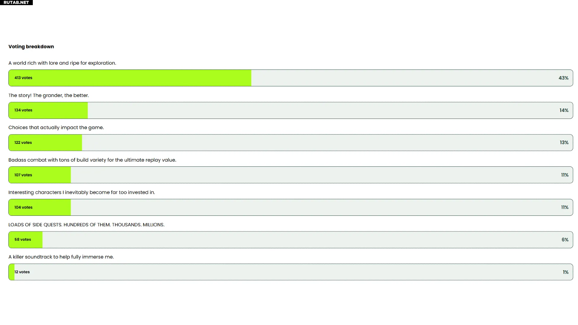 Неожиданностью для авторов опроса стал низкий интерес к обилию побочных заданий, которые оказались в приоритете у немногих. Также отдельным пунктом была добавлена музыка, но она стала самым важным элементом лишь для 12 респондентов.