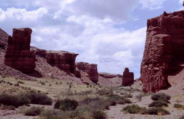 В двухстах километрах к востоку от Астаны вы найдете Чарынский каньон. Являясь частью Чарынского национального парка, каньон протянулся вдоль реки Чарын на восемьдесят километров. По форме он похож на Гранд-Каньон в США, а его глубина местами достигает 300 метров. На двух из этих восьмидесяти километров лежит Долина замков, область скальных образований столбов и других форм, созданных из местного красного песчаника, как вы можете видеть на фотографии.