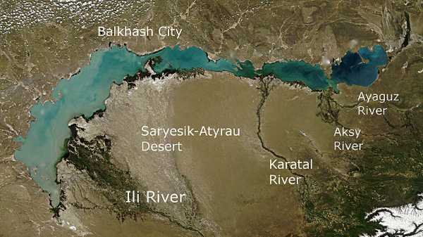 Озеро Балхаш находится в восточном регионе Казахстана и является бессточным озером, как и Каспийское море. В начале 21 века его площадь составляла около 16 400 кв. км. но его площадь с годами уменьшилась, поскольку вода, которая должна была попасть в озеро, использовалась для орошения ферм. Озеро питают семь рек, основным источником воды является река Или, берущая начало в китайских горах за границей. Озеро Балхаш с годами уменьшается, как и Аральское море. Напротив, Каспийское море росло, причина которого учеными до конца не понятна.