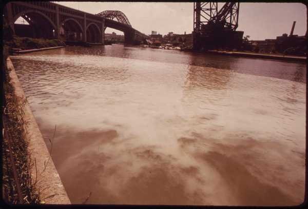 Река Кайахога, протекающая через город Кливленд, штат Огайо, известна или, возможно, печально известна тем, что в 20-м веке неоднократно загоралась. Эта претензия на известность связана с высоким уровнем загрязнения реки. Хотя большинство загрязняющих веществ представляют собой промышленные отходы, неочищенные сточные воды регулярно откачивались на протяжении десятилетий. Между 1868 и 1969 годами река загоралась не менее пяти раз.