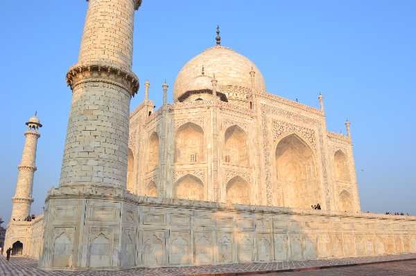 Тадж-Махал — мраморный мавзолей, построенный императором Шахом Джеханом в память о его самой любимой жене Мумтаз. Расположенный на берегу реки Ямуна, Тадж строился в течение двадцати лет. Комплекс гробницы идеально симметричен: четыре минарета, обрамляющие мавзолей, слегка наклонены наружу, так что в случае землетрясения они отвалятся от гробницы.