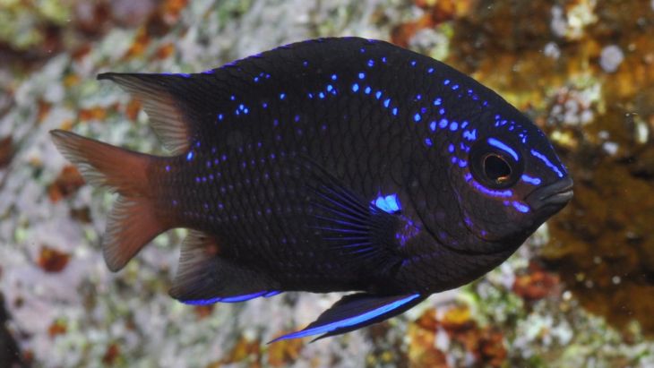 Эта прекрасная рыбка (всего 10 см в длину, так что не думайте, что вы сможете поймать ее на ужин!) имеет светящийся темно-синий контур. Она принадлежит к семейству pomacentridae, как и рыба-клоун. Они питаются водорослями и мелкими беспозвоночными, а самец защищает икру в период нереста. Сорт встречается вокруг Азорских островов, Мадейры, Диких островов, Кабо-Верде и у побережья Сенегала.
