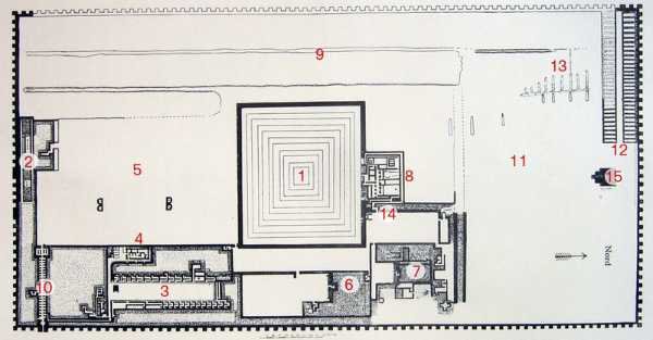 Под ступенчатой пирамидой имеется также целый лабиринт проходов, а также Северный храм, использовавшийся как заупокойный храм, Сердабский двор, из которого «ка» фараона мог наблюдать за церемониями, и Хеб-седский двор, где проводилась церемония, посвященная правлению фараона. В целом комплекс занимал около 40 акров.