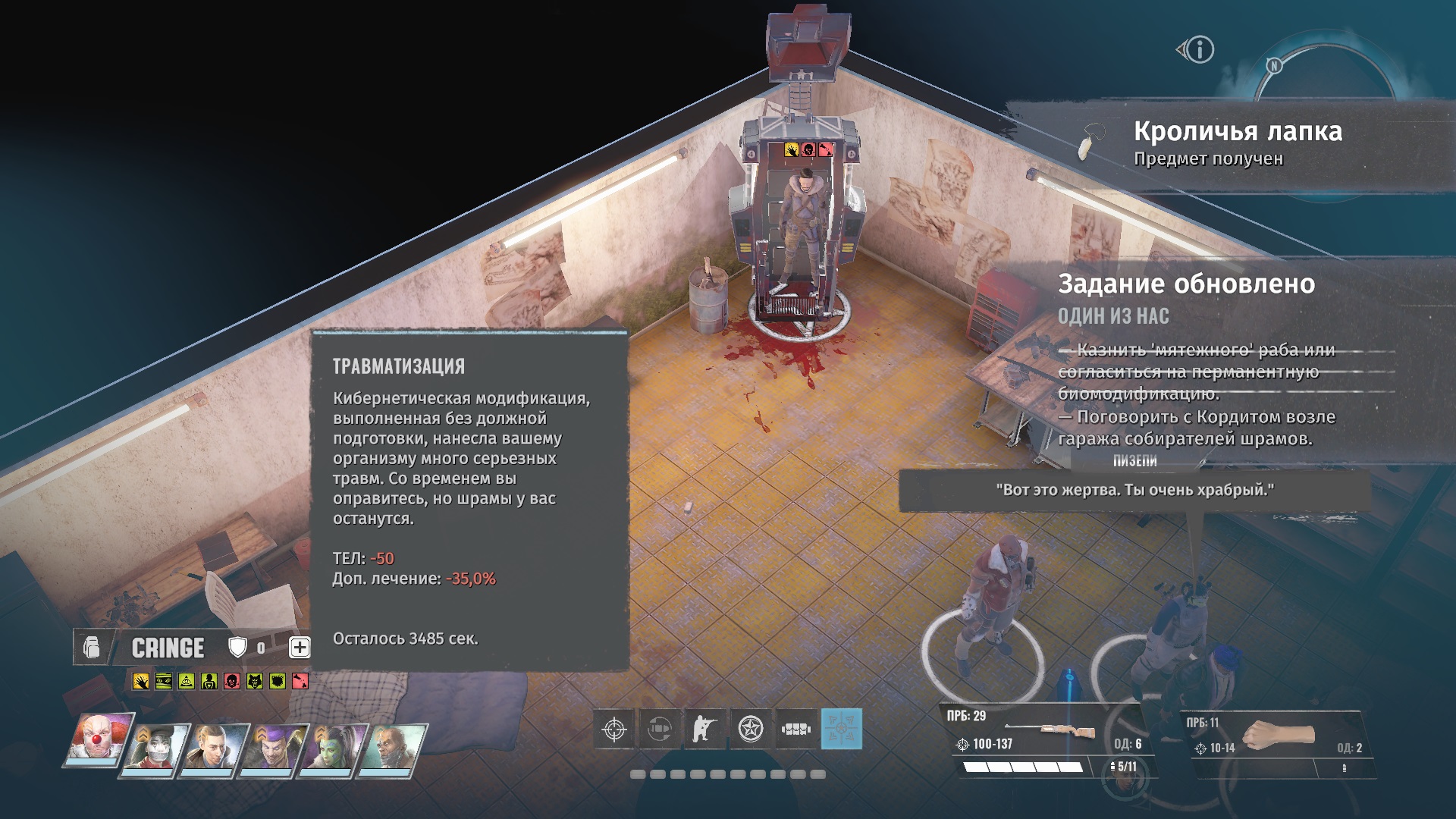 Если вы выберите установку модификации, то приобретете талант Киборг, который позволит вам пользоваться модификациями киборгов. Но так же вместе с этим получите временный дебаф травматизация, который режет получаемое лечение на 35 процентов, а так же дает - 50 к телосложению.