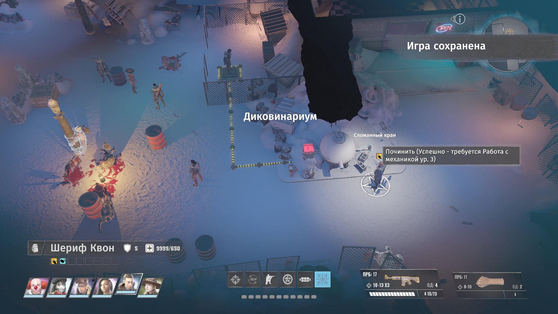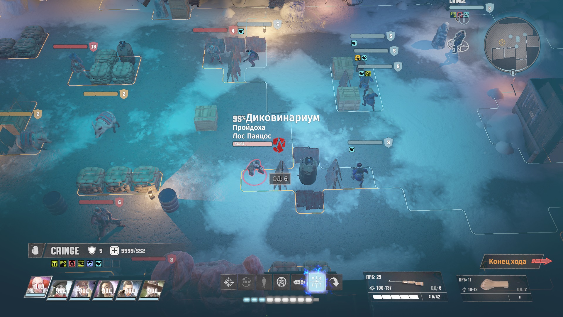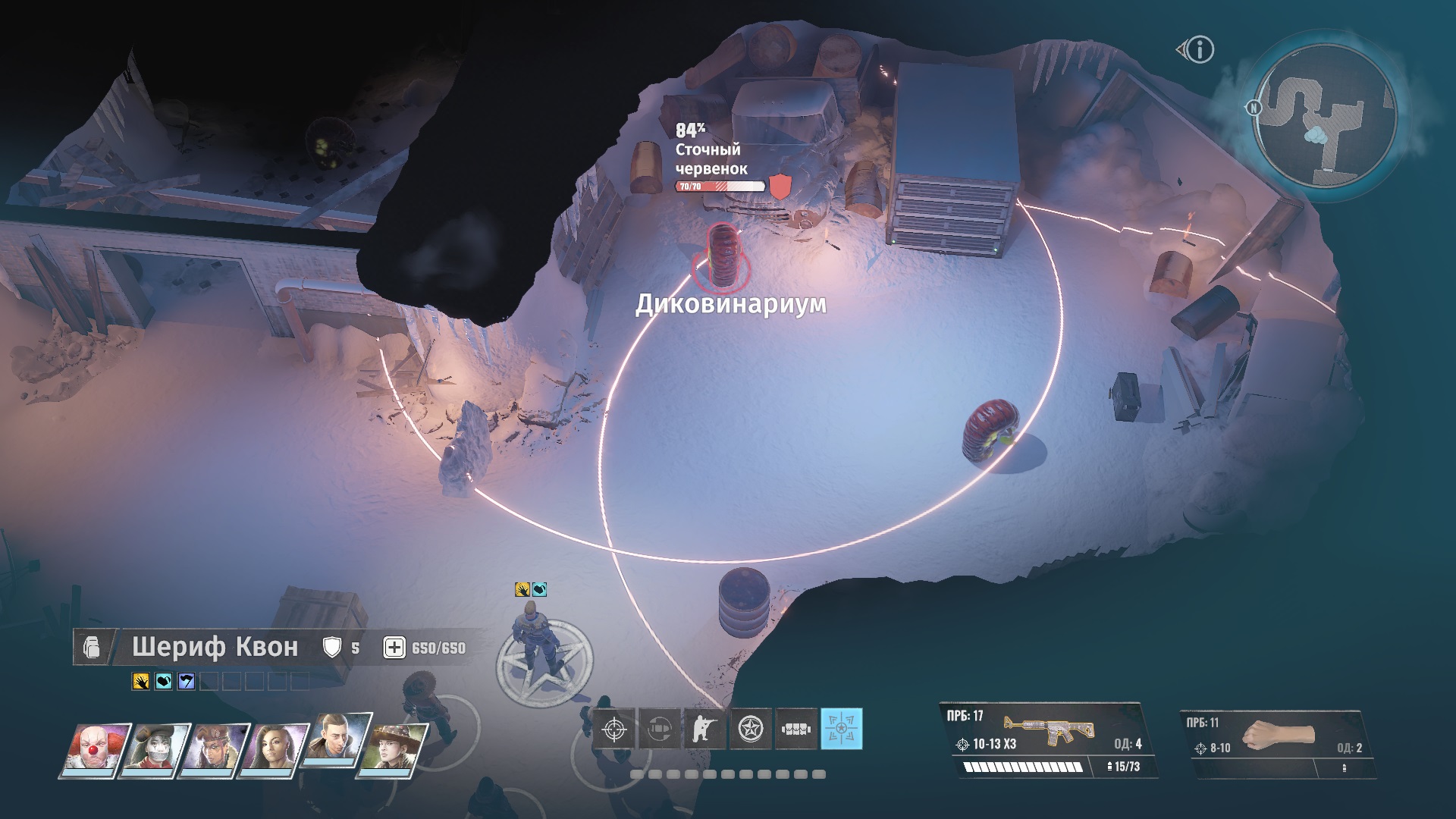 В этот раз вам не надо переживать за взрывающихся свиней, но зато появляется другая проблема - на поле боя очень мало укрытий. Постарайтесь разместить дальнобойных бойцов за барной стойкой и дальней скамейкой, а остальных - за бочкой и коробками. Так же не забывайте разбивать азотные баллоны, они заморозят врагов и снизят их AP.