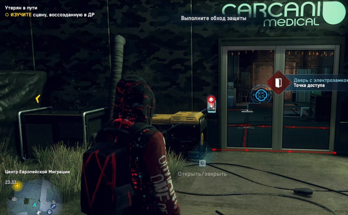 Дальше следуйте за последним желтым маркером миссии, чтобы найти клинику поблизости. Прежде чем вы попытаетесь войти внутрь, обратите внимание, что снаружи на стене клиники есть красная панель. Бегите вверх по лестнице к маркеру миссии и взаимодействуйте с панелью, чтобы загрузить данные Дополненной Реальности. Теперь вам нужно будет найти способ проникнуть в клинику, выполнив головоломку обхода сети.
