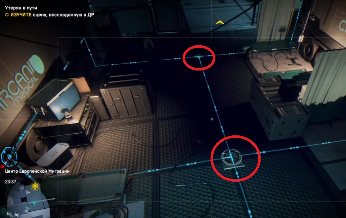Как только вы завершите головоломку обхода сети, активируете на желтой метке Дополненную Реальность, перед вами начнут воссоздаваться события с Анхелем. Он сидит на стуле, рядом работник клиники, Анхелю вживили что-то в организм, он пытается уговорить работника оставить его в покое, это не помогает, тогда Анхель ударяет работника и сбегает.