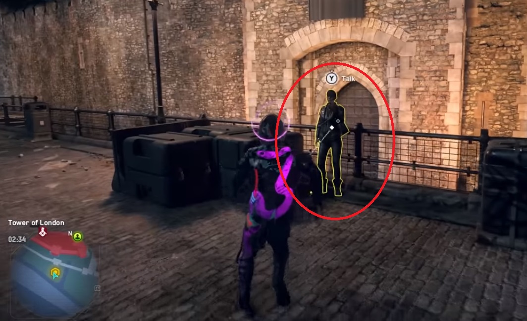 Следуйте обновленному маркеру миссии к неизвестному человеку за стеной здания, который может помочь вам завербовать сотрудника Альбиона в DedSec. За пределы неприступных стен вы можете попасть по коробкам и деревянным постройкам тут: