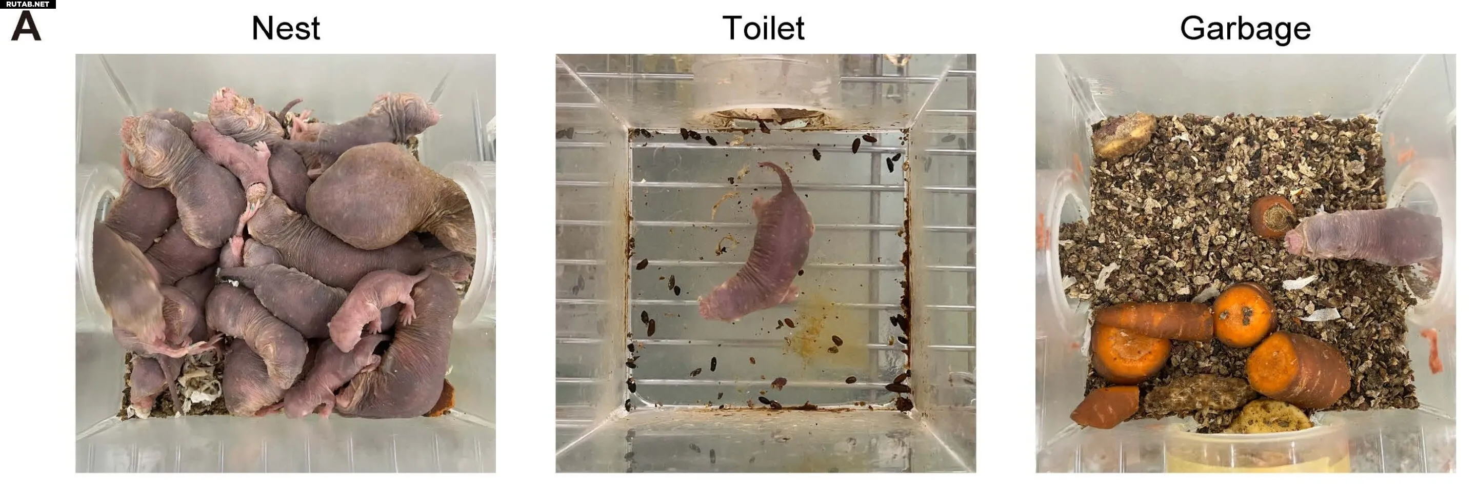 Учёные создали для землекопов искусственные норы с девятью камерами, соединёнными туннелями. Животные самостоятельно распределили помещения по функциям: спальня, туалет, мусорная зона и другие. Интересно, что туалеты и гнёзда обычно располагались в углах, а мусорные камеры — в центре, при этом гнёзда часто перемещались.