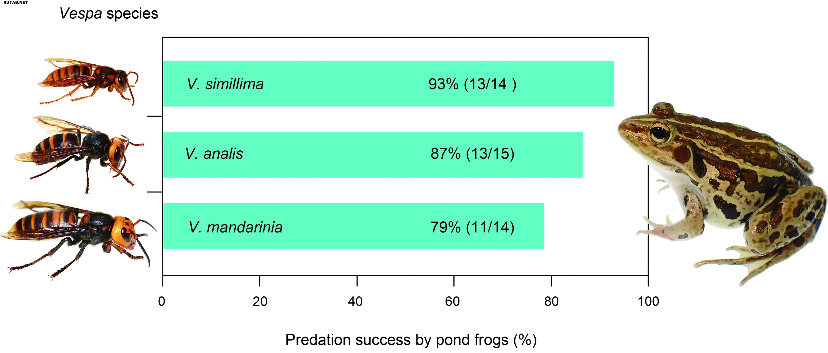 В исследовании, опубликованном в журнале Ecosphere, учёный приводит поразительные доказательства того, что взрослые прудовые лягушки активно атаковали рабочих шершней всех трёх видов. Более того, 93%, 87% и 79% лягушек в итоге съели V. simillima, V. analis и V. mandarinia соответственно, несмотря на укусы в рот или даже в глаза.