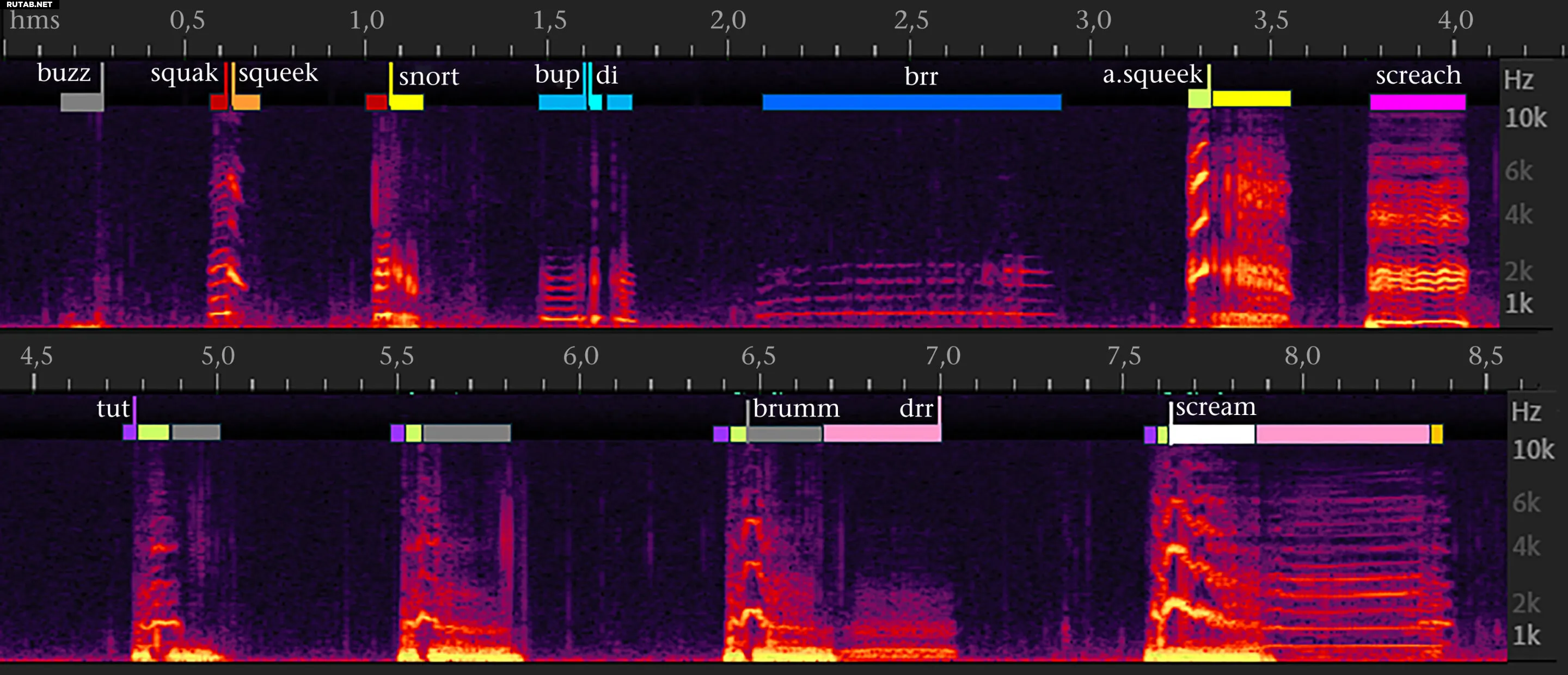 Анализ показал, что около трети элементов используются преимущественно поодиночке, а остальные комбинируются с другими. При этом существуют чёткие правила комбинации: некоторые элементы характерны для начала крика, другие — для конца или середины. Длина крика также влияет на позицию элемента.